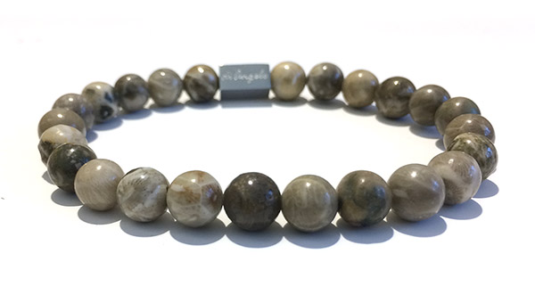 Natural Gemstone Chrysanthemum Fossil Coral Bracelet beads with a diameter of 8 mm, combined with 1 scratch free stainless steel “diAngelo” logo anchor bead 11 x 6 mm.