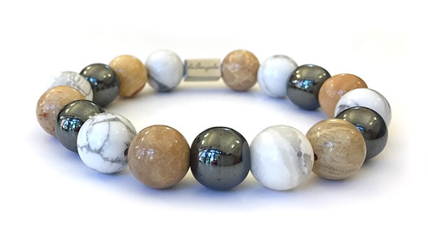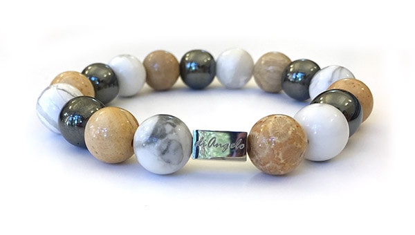 Natural Gemstone Chrysanthemum Fossil Coral & Hematite & Howlite 12mm Bracelet Bracelets beads with a diameter of 12 mm, combined with 1 scratch free stainless steel “diAngelo” logo anchor bead 11 x 6 mm.