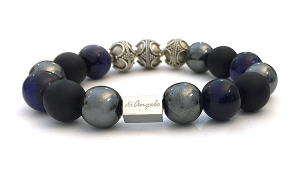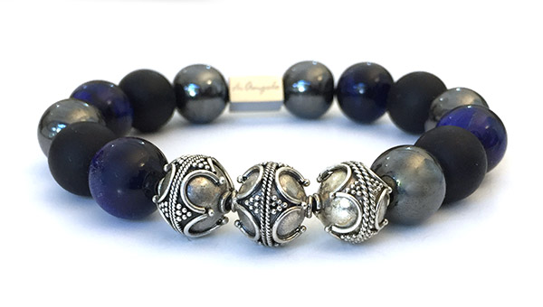Natural Gemstone Matte Obsidian & Hematite & Blue Tiger’s Eye + 3 Handmade Bali Beads 925 Silver Bracelet beads with a diameter of 12 mm, combined with 1 scratch free stainless steel “diAngelo” logo anchor bead 11 x 6 mm.