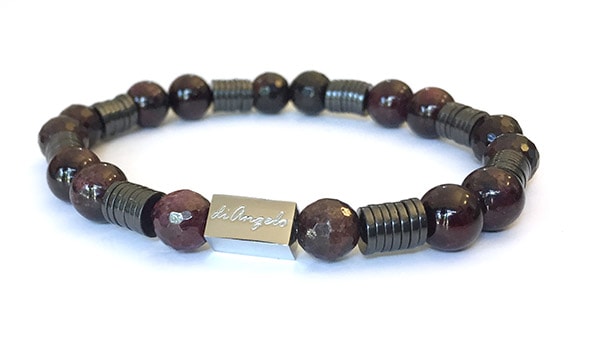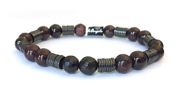 Natural Gemstone Red Garnet + Red Garnet Faceted 08mm + Hematite Discs Bracelet beads with a diameter of 8 mm, combined with 1 scratch free stainless steel “diAngelo” logo anchor bead 11 x 6 mm.